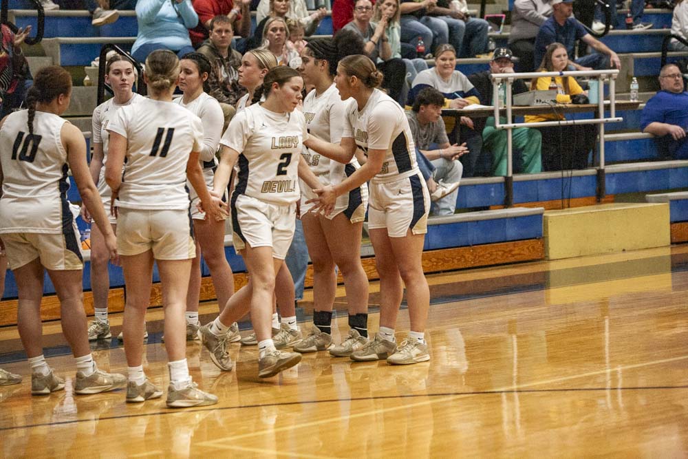 Scoring for the Lady Devils: J. Bowers15, L. Curry 9, A. Jones 7, R. Cook 1, E. McGowan 6, R. Pitts 5, L. Taylor 11.