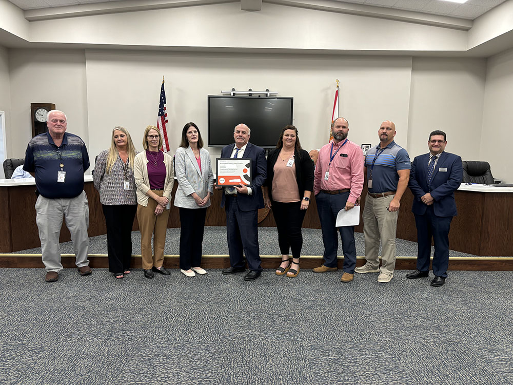 (Pictured L to R – Directors Dewayne Geoghagan, Kimberly Register, Lucy Carmichael, Susan Saunders, Superintendent Joseph Taylor, Directors Becky Dickson, Troy Peoples, Kyle Newsom and Cognia Director Andy Martinez)